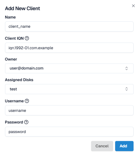 Client IQN- unique client name. It may contain no more than 64 characters. It should start withiqnand match the following template:iqn.<year, four digits>-<month, two digits>.<reverse domain name>[optional string starting with ':']reverse domain nameshould contain characters in[0-9a-zA-Z]and'.' '-'optional stringshould start with':'and contain characters in[0-9a-zA-Z]and'.' '-' '_'