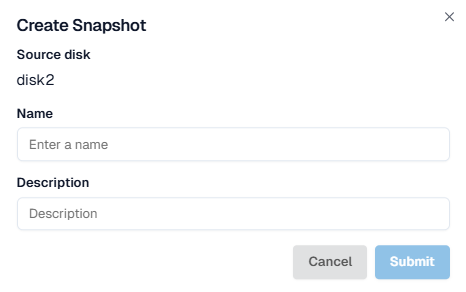 Snapshotspage, click the action button next to the required snapshot and selectCreate Disk from Snapshot. - In the modal window that appears, fill in the