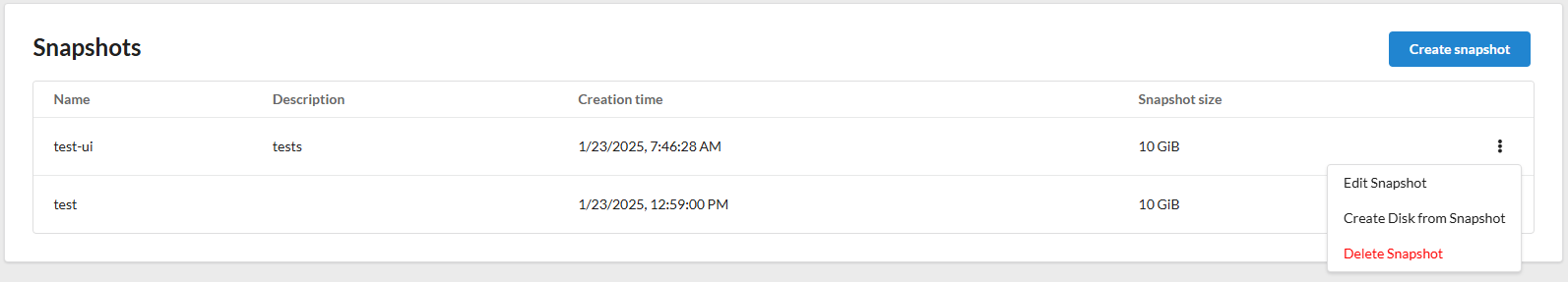 The created snapshot will be displayed on the Snapshots page. On this page, you can also create new snapshots and view previously created ones.