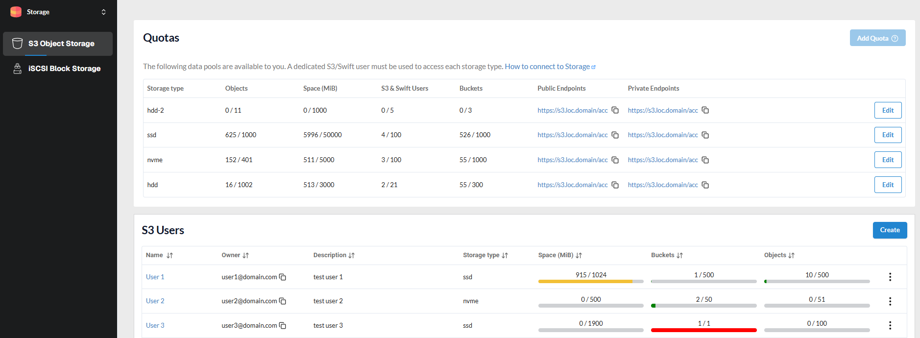 The service interface is divided into two blocks: Quotas and S3 Users.